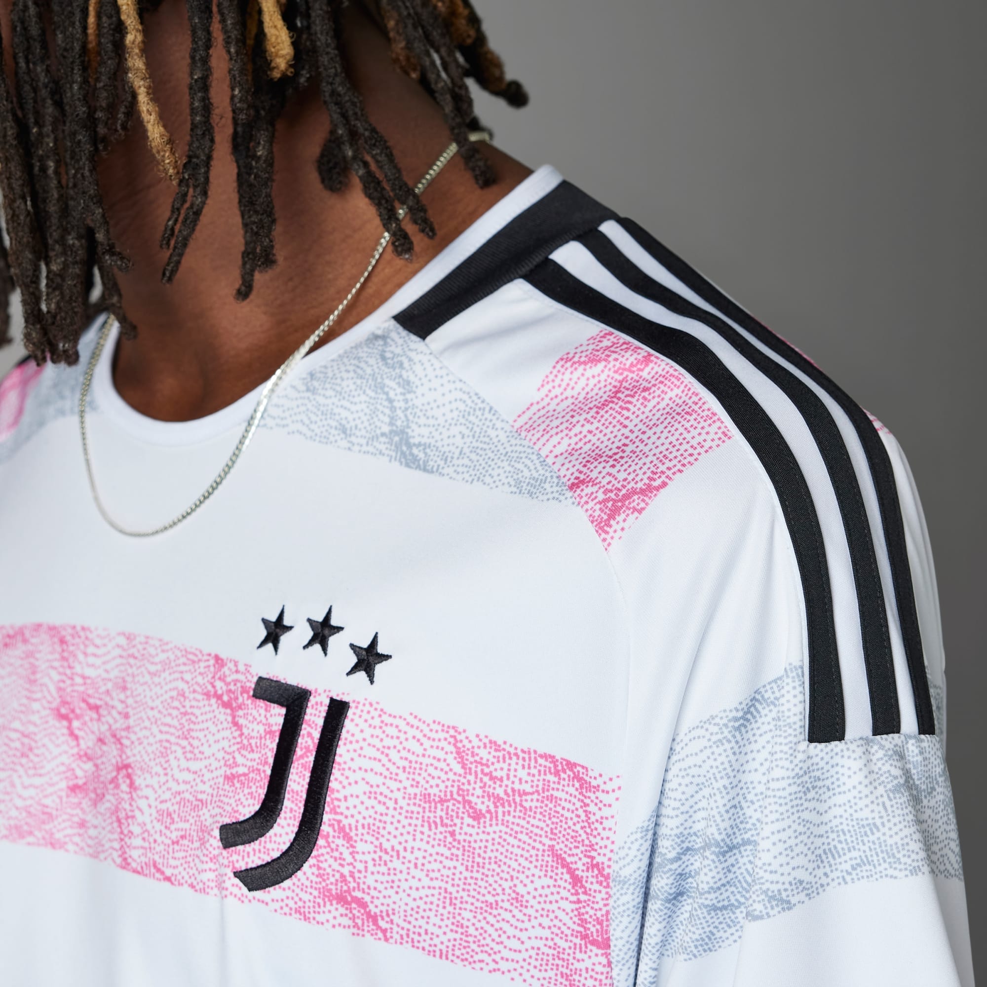 La nueva camiseta visitante de la Juventus 23/24 está inspirada en el imponente Monte Rosa de Turín. Unas franjas rosas y grises ascienden sobre una impecable base blanca creando una textura escarpada muy llamativa. La tecnología de absorción AEROREADY ayuda a mantener tu piel seca. El escudo termotransferido demuestra tu pasión por el club. Esta prenda está confeccionada con hilo que contiene un 50 % de Parley Ocean Plastic, un material que ha sido recuperado de residuos plásticos recogidos en islas remotas, playas, comunidades y zonas costeras, evitando que contaminen nuestros océanos.