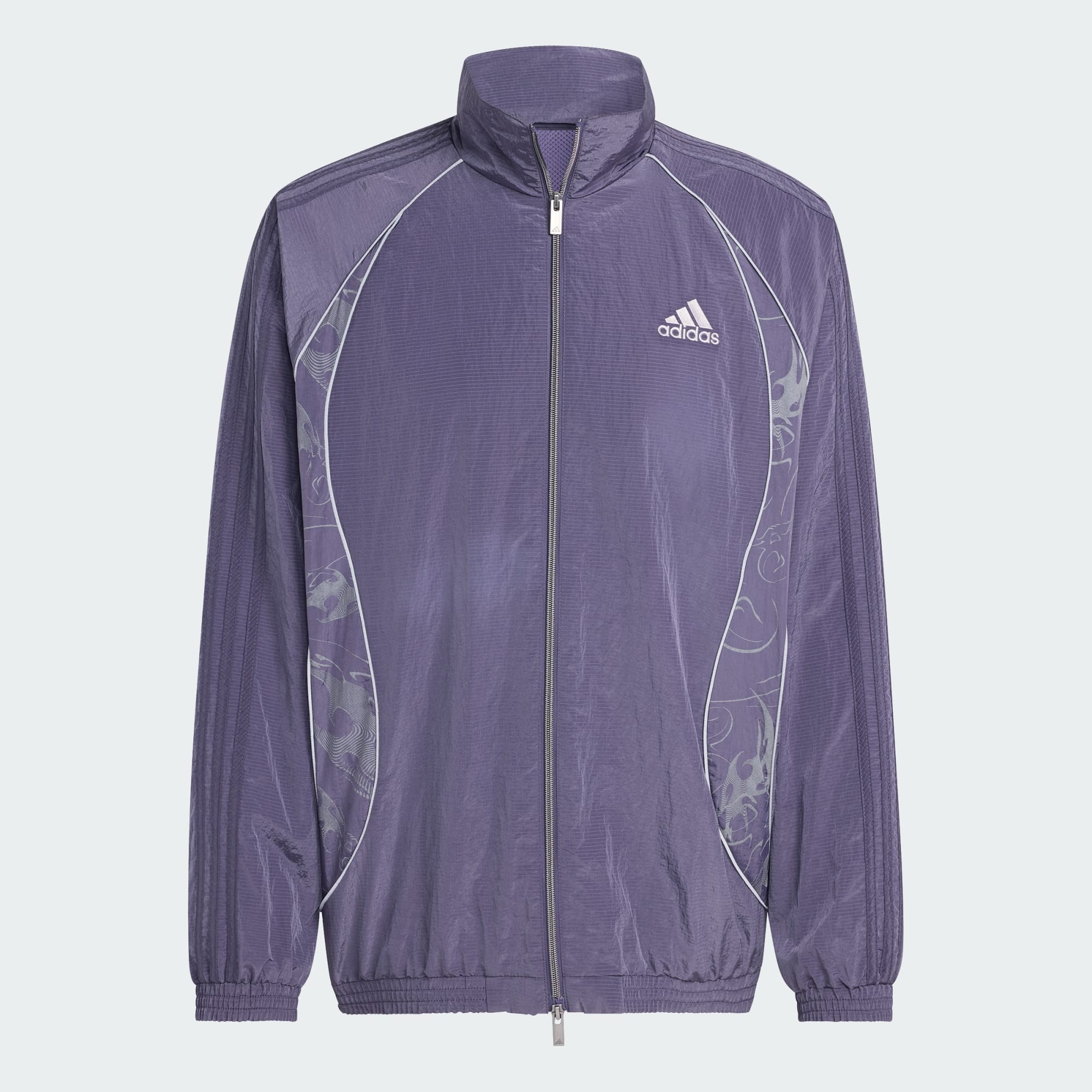 Una chaqueta deportiva de corte holgado con líneas y estampados emblemáticos inspirados en el fútbol.