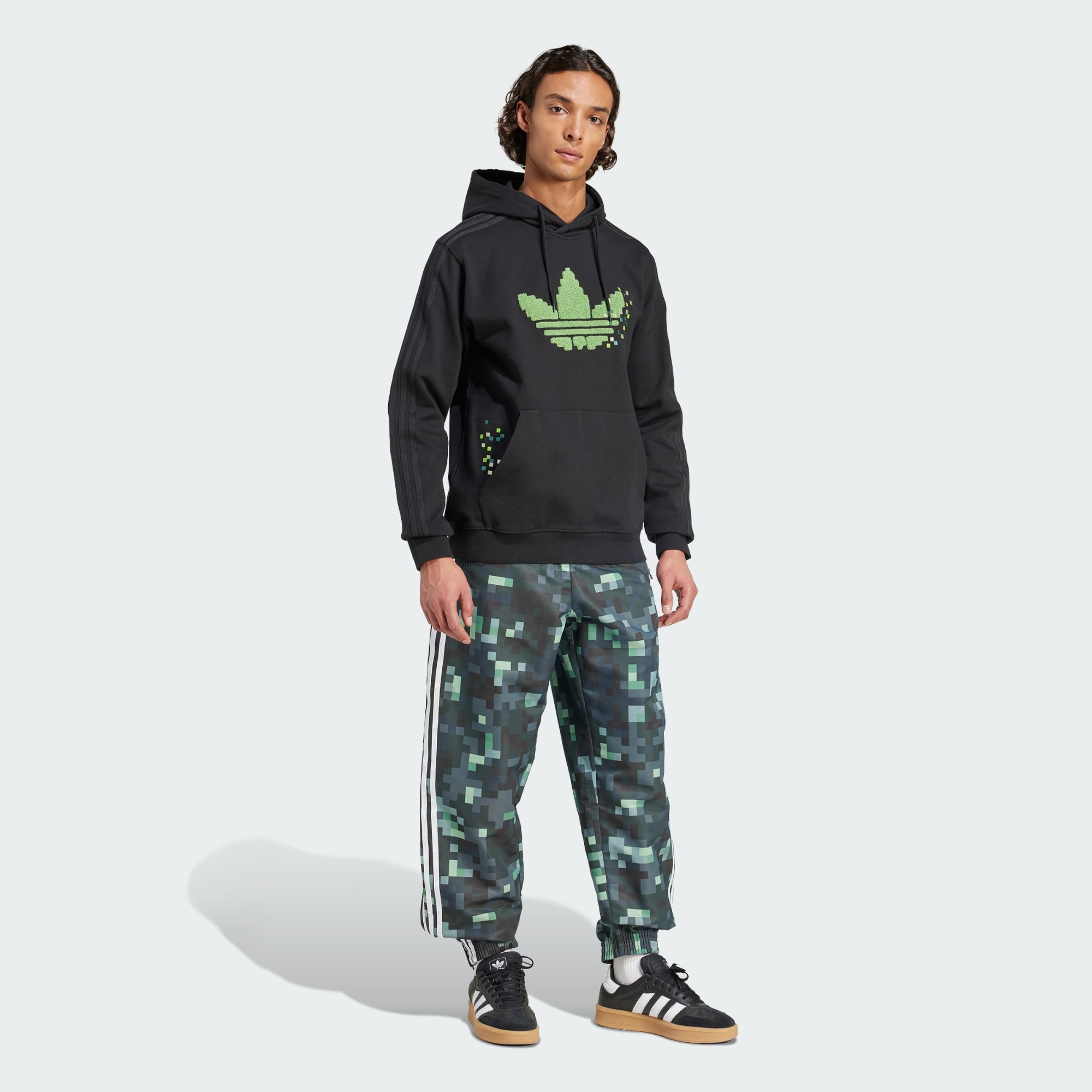 Fruto de la colaboración entre adidas Originals y Minecraft, este polerón con capucha estampado lleva el universo del famoso videojuego más allá de la pantalla. Confeccionado en un suave tejido de algodón, luce un estampado del Trifolio que muta de píxeles a bloques individuales, simbolizando la transición del mundo digital al real, tal y como ocurre en la película.