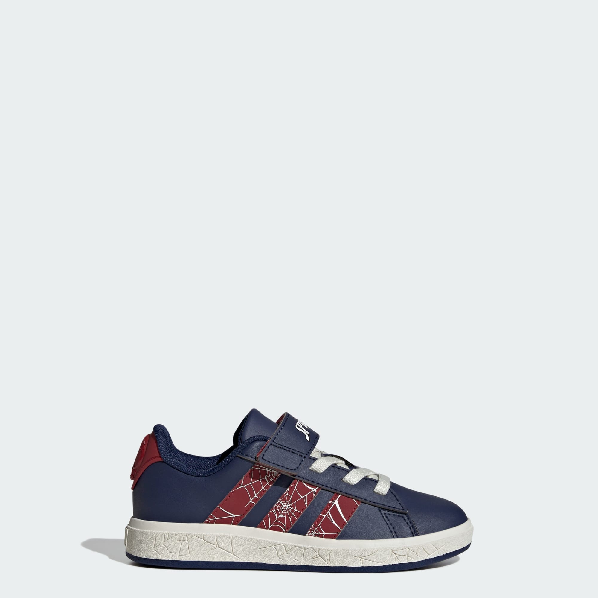 Un perfil clásico de adidas con detalles de Spider-Man y una tira fácil de ajustar.