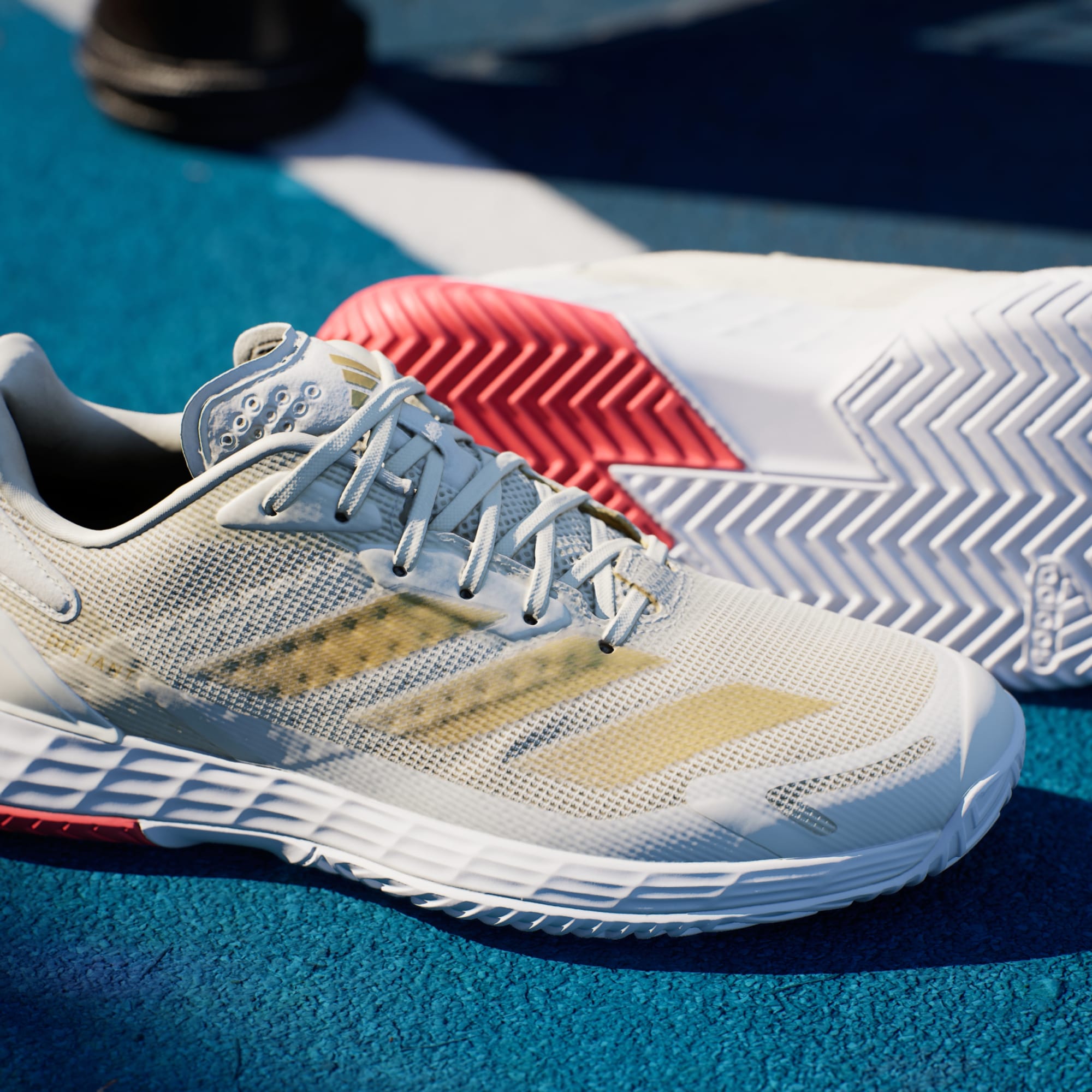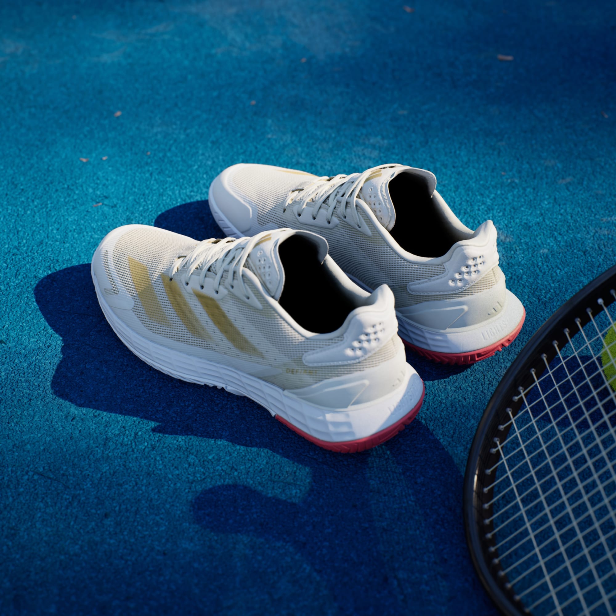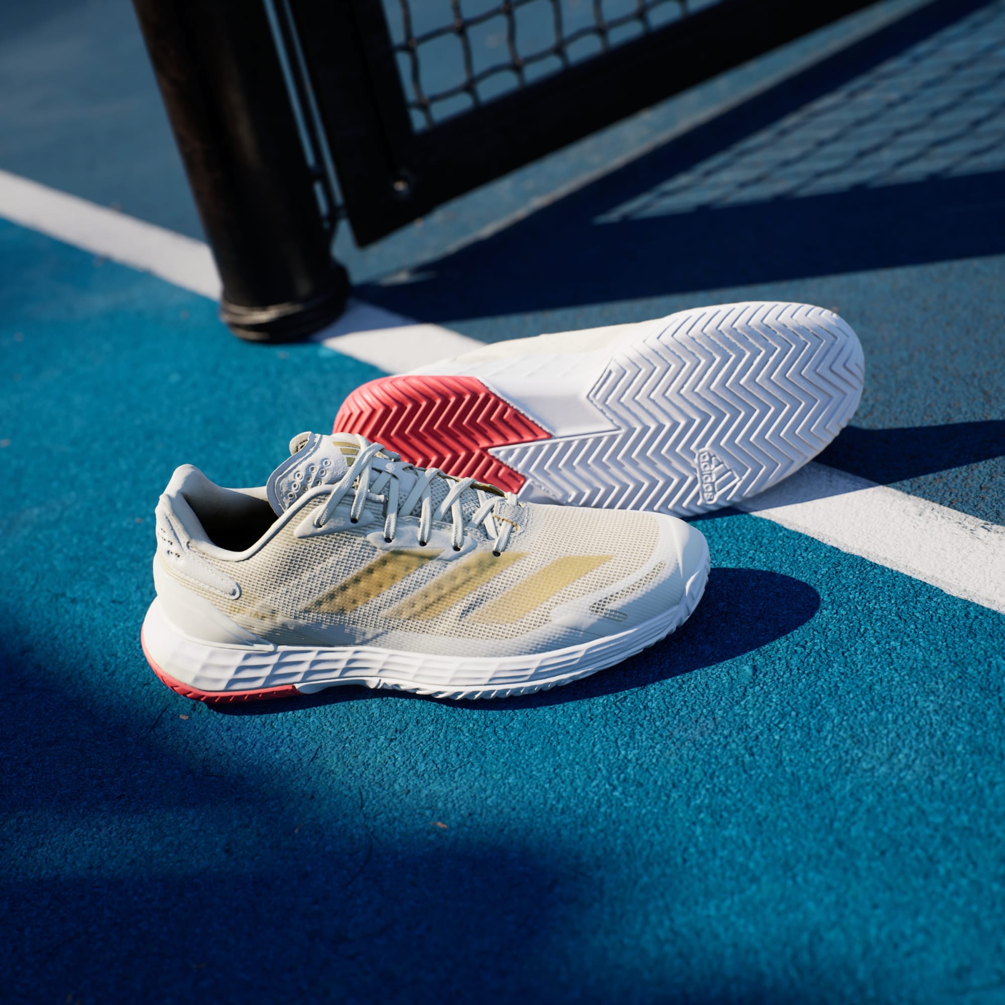 Piensa rápido, muévete rápido. Estas zapatillas adidas para jugar tenis te permiten moverte con total libertad en la cancha. La mediasuela Lightstrike ofrece amortiguación receptiva, una velocidad superior y una sensación de contacto con el suelo. El exterior de malla, que trabaja en armonía con una plantilla moldeada y TPU en el talón, mantiene el pie seguro y ventilado.
