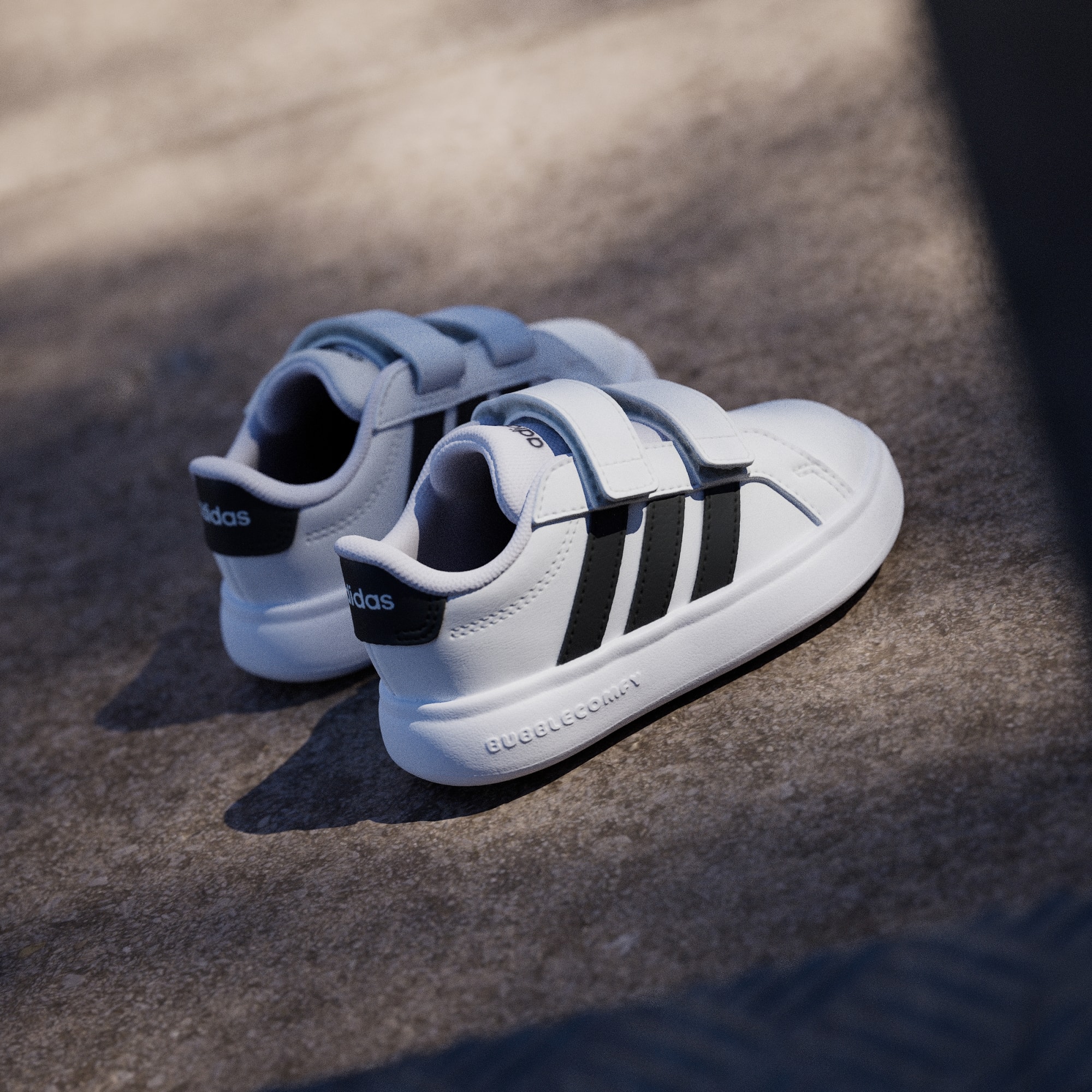 Diseñadas para niños que no paran y padres que se preocupan por su comodidad, estas zapatillas son una reinvención divertida y adaptada a los niños de un clásico emblemático de adidas. Desde el talón hasta la puntera, estas zapatillas hacen que los pies pequeños se sientan bien. La suela de EVA proporciona a los más pequeños una experiencia suave, como si caminaran sobre una nube, lo que favorece la comodidad y el movimiento natural del pie. Diseñadas para acompañar las aventuras infantiles, estas zapatillas también pueden soportar los percances. Los padres apreciarán los materiales duraderos y la calidad de fabricación, mientras que las correas fáciles de ajustar facilitan la tarea de sujetar los piececitos. Los colores vivos y la mezcla de diferentes texturas capturan la imaginación de los más pequeños, mientras que la divertida y funcional suela en forma de burbuja añade otra dimensión lúdica. Como primeras zapatillas adidas, no hay nada mejor que el estilo y la comodidad «bubbletastic».