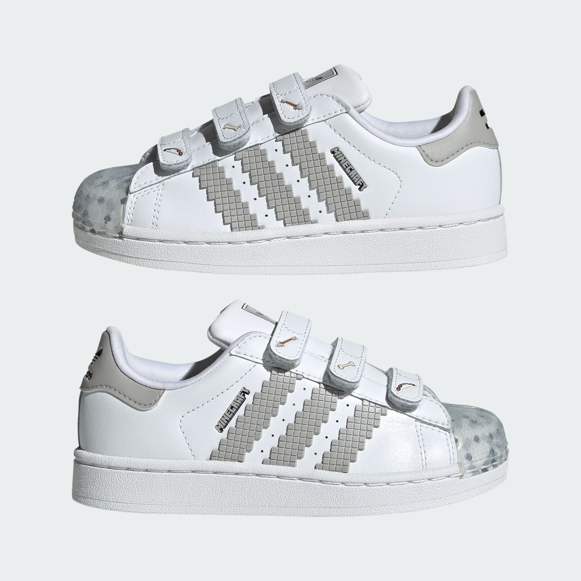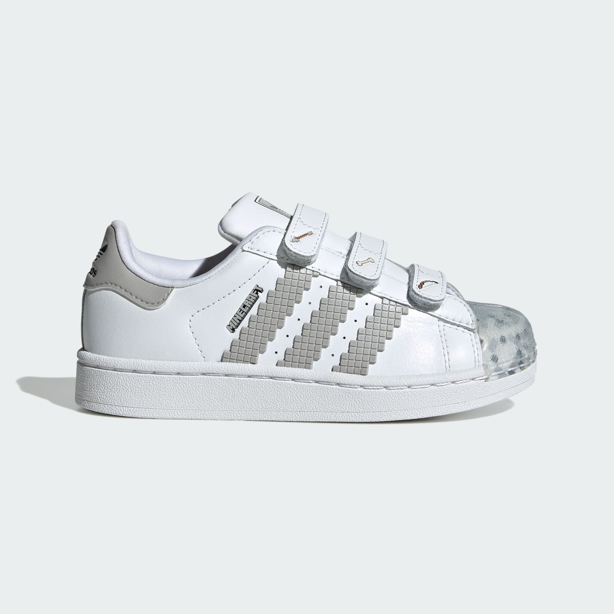 Pueden explorar el Sobremundo, el Inframundo y más allá con estas zapatillas para niños. La adidas Superstar ha sido un icono durante más de 50 años, y este par se une a Minecraft para una colaboración cargada de bloques que gira en torno a la expresión creativa. El exterior de cuero y la puntera clásica de goma con relieve se mantienen fieles al diseño original. Los detalles pixelados y los estampados de herramientas en las tiras ajustables de cierre por contacto los preparan para el Modo Supervivencia o para cualquier otra aventura.