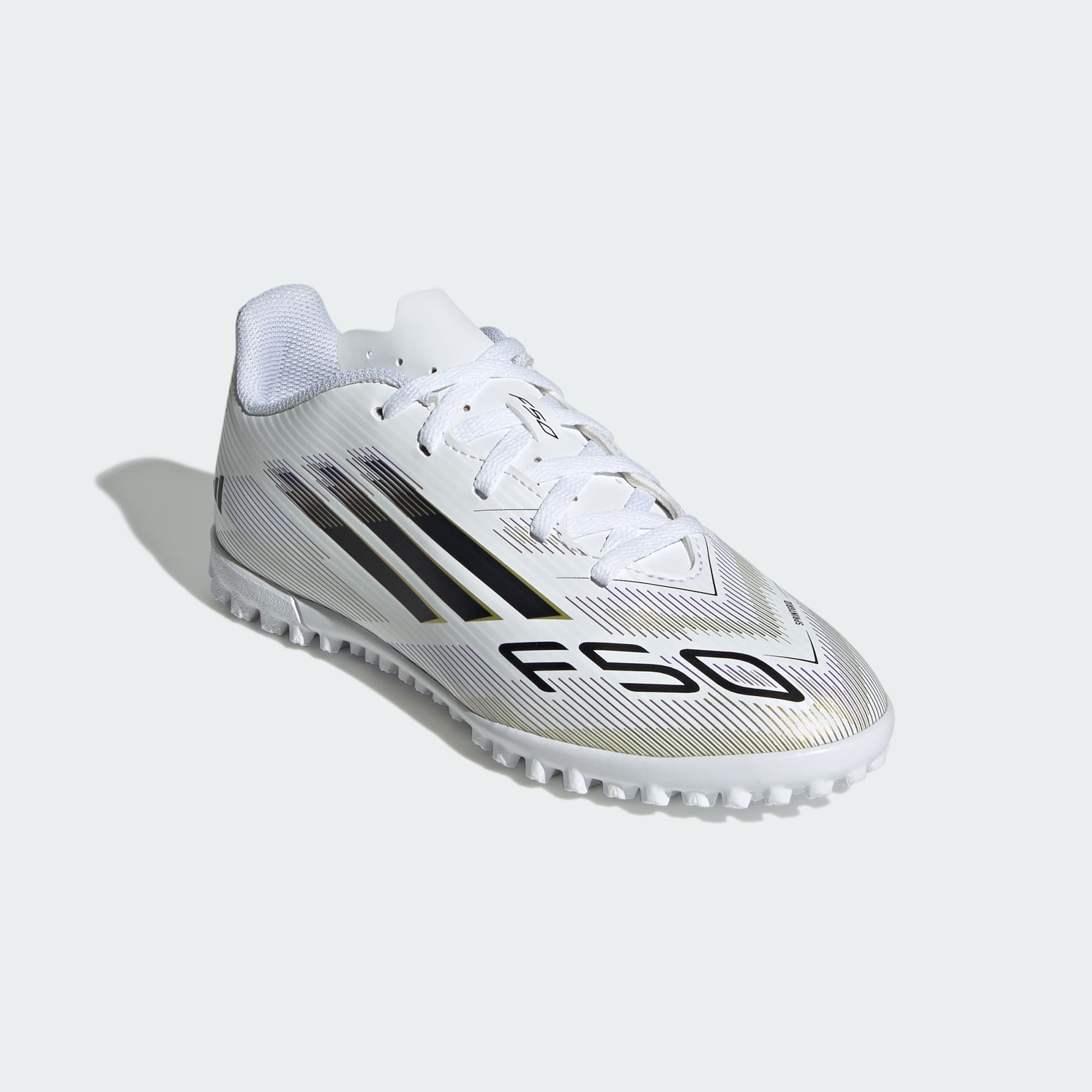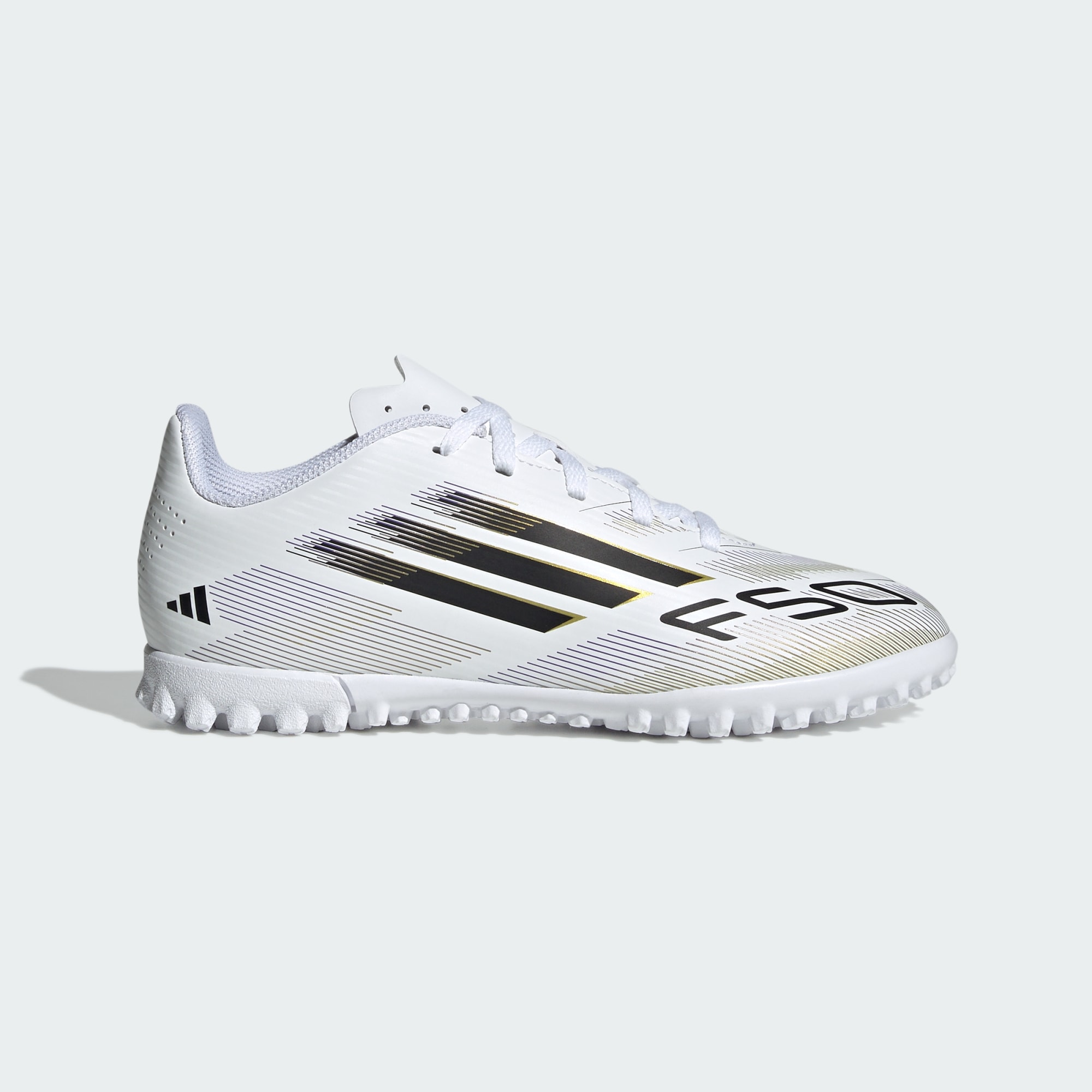 Encuentra tu rapidez para expresarte de verdad en la cancha. Siente la adrenalina con los zapatos de fútbol adidas F50, hechos para correr. Estos zapatos de fútbol Club para jóvenes presentan un exterior de material sintético ligero y una lengüeta perforada que te ofrecen una comodidad extraordinaria. Dales la vuelta y encontrarás una suela de goma con taches que favorece el juego rápido sobre césped artificial.
